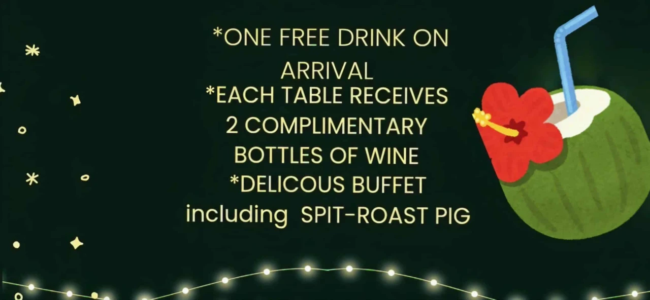 Get ready for live music that'll get you moving, a mouthwatering buffet featuring a spit-roast pig, and amazing drinks. Your ticket includes a free drink on arrival, and every table scores TWO complimentary bottles of wine!